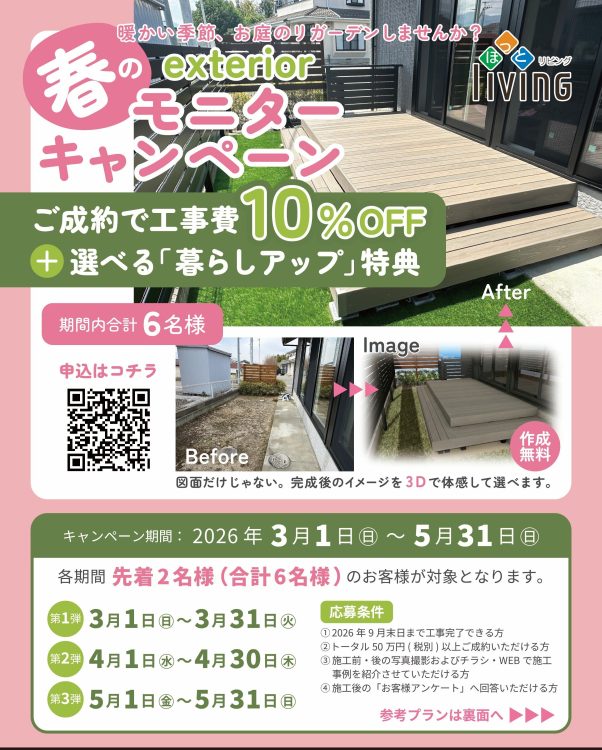 ほっとリビングでは、現在「春のエクステリアモニターキャンペーン」を開催中です。